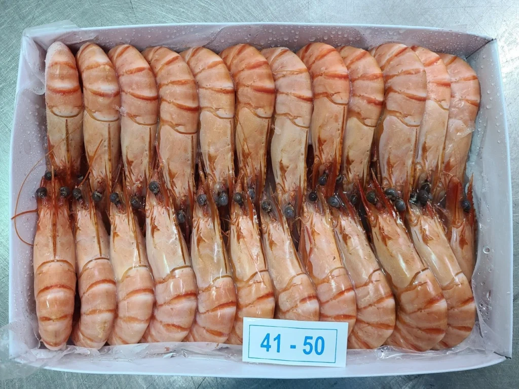 Shrimp is cooked, keep the natural color, firm flesh, sweet taste, bold, convenient use and processing.